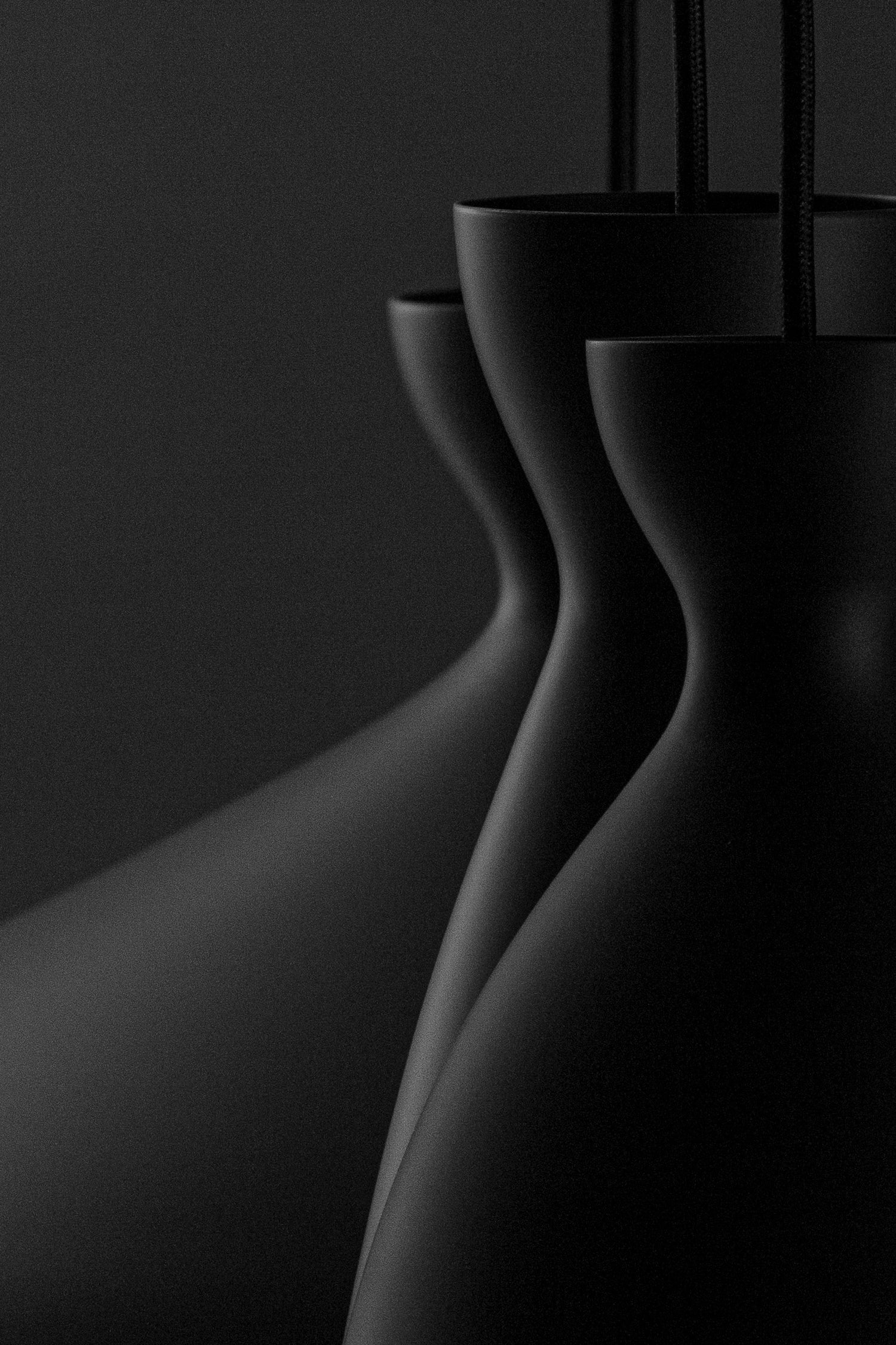 Pretty wide gibt offenes, direktes Licht; Pretty long fokussiert einen klaren, schmalen Lichtkegel; Pretty small ist die kleine, klassische Variante. Die Lichtwirkungen der Schirme werden durch hochwertige Oberflächen variiert – weiches Licht geformt von mattem Weiß, brillantes Licht in mattem Schwarz.